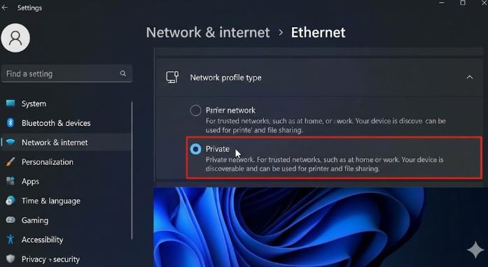 - 네트워크 프로필 유형을 [개인(Private)]으로 변경합니다.