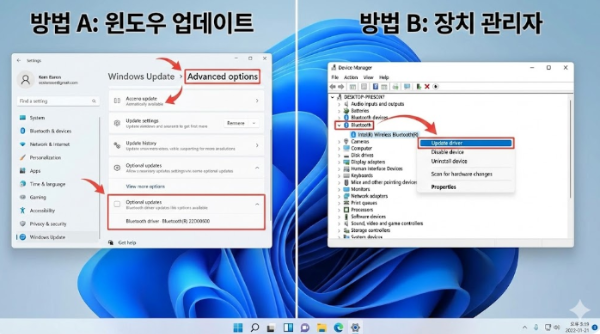 키를 눌러 설정창을 연 다음, [Windows 업데이트]로 들어가서 '업데이트 확인' 버튼만 누르면 됩니다. 만약 여기서 안 뜬다면 '고급 옵션'의 '선택적 업데이트'를 확인해보세요. 거기에 숨어있는 블루투스 드라이버를 체크하고 설치하면 끝! 정말 간단하죠?
