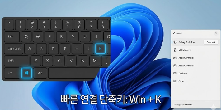입니다. 이걸 누르면 바탕화면 우측 하단에 연결 가능한 기기 목록이 촤르륵 떠요. 설정창 들어갈 필요 없이 클릭 한 번으로 연결! 이거 진짜 편해요. 그리고 갑자기 작동이 안 될 땐, '설정 > 시스템 > 문제 해결 > 기타 문제 해결사'에서 Bluetooth 실행을 눌러보세요. 윈도우가 스스로 진단하고 고쳐주는데 은근히 효과가 좋습니다.